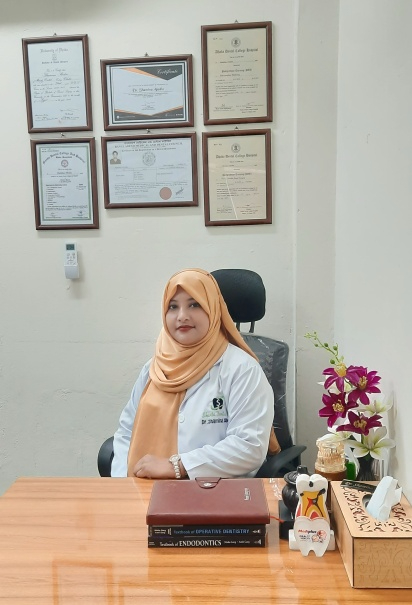 Dr. Shamina Abedin at her clinic desk with dental equipment and certifications in the background.